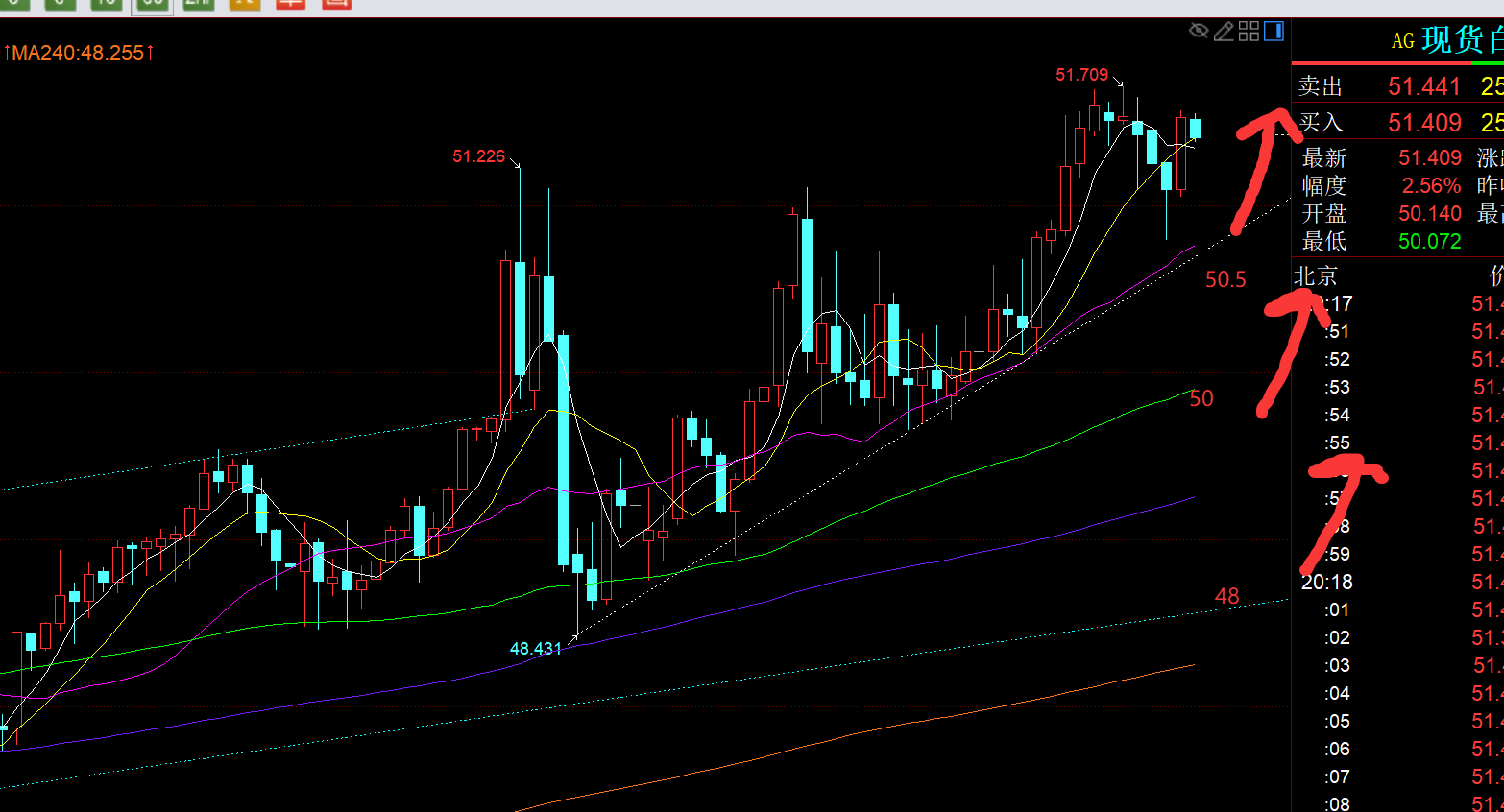第二,白银方面:波幅这两日急速扩大,日内稍微动一下就是0.4-0.5, 上周五亚盘提及,突破50后胆大的可直接追涨,目标51到位,只是当时防守的确不好带,除非波段; 欧盘大幅连阳拉升,再次冲击隔夜高点51.1-51.2,则美盘前后跟随看涨,只是比较可惜,回踩稍多了一点,刚好刺破再美盘拉升抵达原先目标;