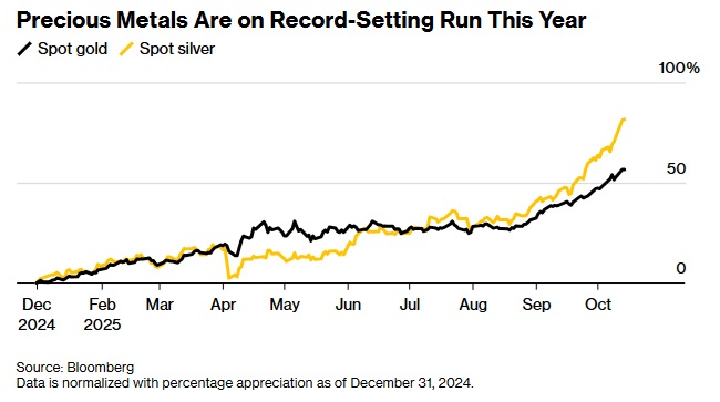 今年以来,四种主要贵金属价格涨幅介于56%至81%,这波涨势主导了大宗商品市场。黄金的上涨得益于央行购金、交易所交易基金(ETF)持仓增加以及美联储降息。中美贸易紧张局势的反复出现、美联储独立性受到威胁以及美国政府关门也助长对避险资产的需求。