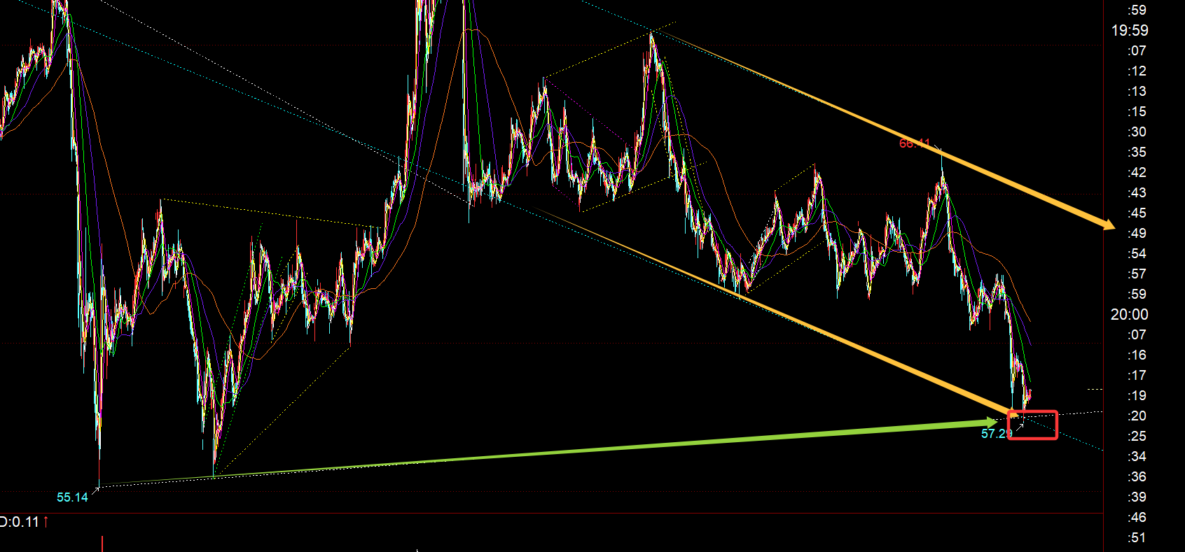 原油方面:黄色通道下轨和绿色趋势线支撑共振点,昨晚基本试探了,且出现一些反弹,这个周视频中已经提及了;那么接下来就看反弹力度,阻力60、61.4不变;