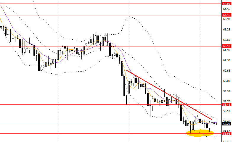 美原油刺破前低,继续承压于5日均线,日线RSI仍位于低位,4小时回踩56附近支撑再度企稳,呈双底,空头动能减弱,后市预计将延续低位震荡,可暂时观望。