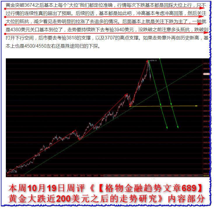 昨日黄金开盘4355.67美元,最高4375.49美元,最低4081.50美元,收盘4124.77美元,报收巨阴线。上周五我们提及黄金4380承压下跌,过程中跌了193美元,本周周评《【格物金融趋势文章689】黄金大跌近200美元之后的走势研究》提及4380基本到位,后市要注意下跌为主,后市抉择3940美元,昨天文章《【格物金融】神奇的黄金,神奇的一日游》基本重声之前的观点,那就是4380承压下跌,走势类似2011年最后的冲刺,当时黄金1912下跌了一次1703美元,后面刺破高点到1920还是下跌。结果跌太快了,仅仅两个交易日从4380下跌到4000美元大关。从高点到现在,两个交易日跌了375美元,行情杀跌不可谓不厉害。