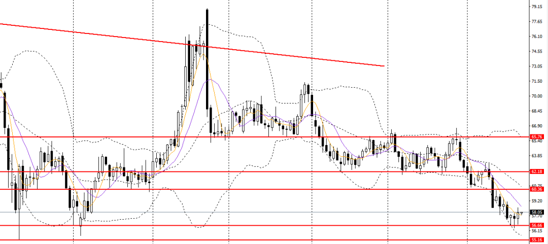 美原油持平前低,徘徊于5日均线附近,空头动能减弱,4小时呈多重底,站上下行趋势线,一度上探58.50一线阻力,短线多单仍可持有,如进一步上破,可看多至59-60,如无法有效上破,多单可暂时离场。