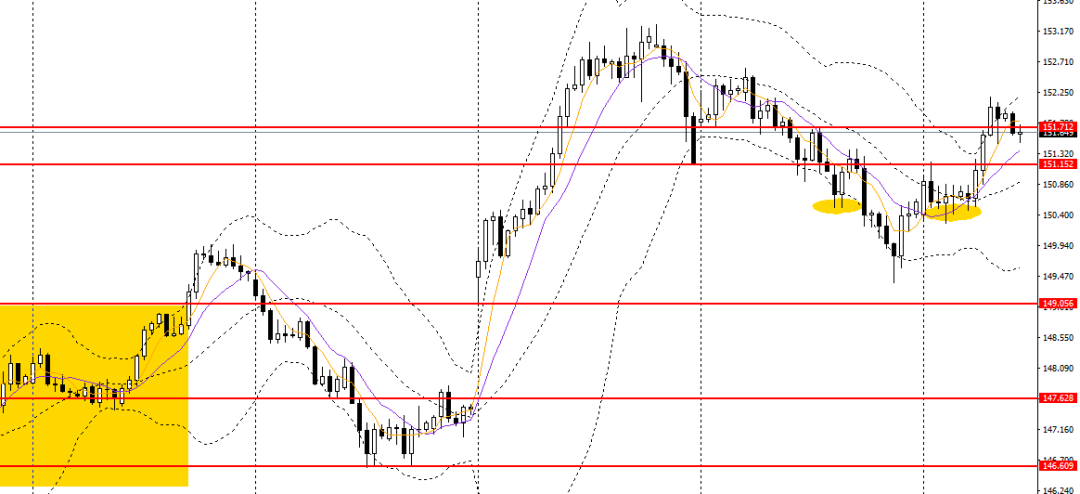 美日一度强势拉升至关键阻力152大关,日线RSI回到50之上,4小时多头动能减弱,如于150.30附近企稳可择机做多,152仍为关键节点,如彻底升破,后市可看多至152.50。