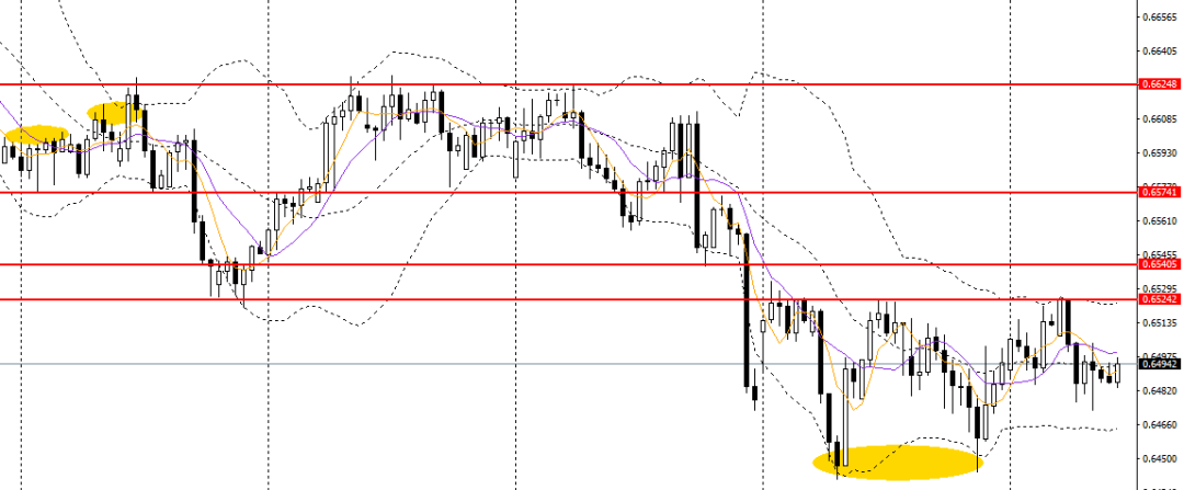 澳美收长阴线,承压于10日均线,日线RSI位于50之下,4小时未能有效升破0.6520附近阻力,短线仍趋于震荡,稳健者可暂时观望。