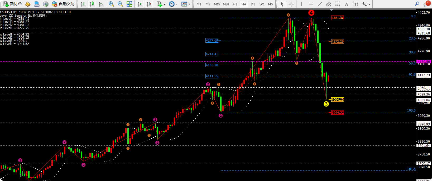 日线指标macd金叉缩量粘合,灵动指标sto快速向下修复,说明价格震荡回落走势,但是昨晚跌幅过大会有修复的时间。目前上方压制在均线MA10和MA5附近分别对应4162-4233一线。根据日线的斐波拉契回调线看目前支撑0.382位置3973一线,压制0.236附近3129一线。
