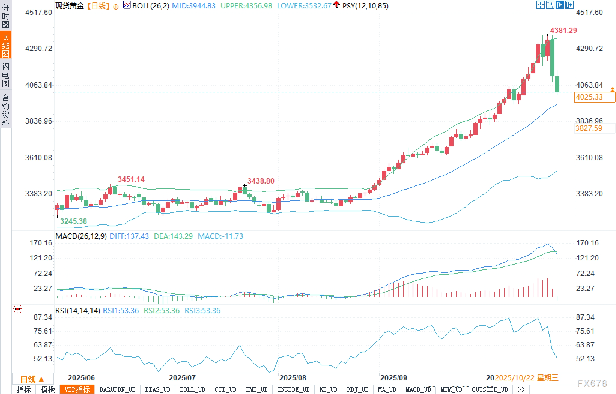 从日线图看,布林带呈明显张口:上轨4356.98、下轨3532.67、中轨3944.83。价格当前处在中轨之上、上轨之下的上半区运行,显示中期上升趋势尚未被破坏,但加速度已趋缓。前高4381.29构成阶段性“供给密集带”,而4100为近两日关键分水岭,价位多次上测未能站稳,短线被动转为阻力位。