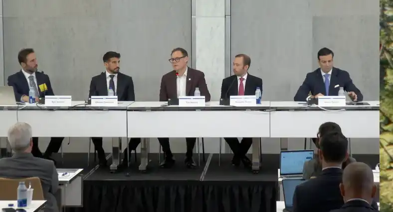 第一个专题讨论的主题是「传统金融与数字资产生态的融合」。主持人是 Jito Labs 的首席法务官丽贝卡·雷蒂格,台上坐着 Chainlink 的联合创始人谢尔盖·纳扎罗夫、Lead Bank 的 CEO 杰基·雷塞斯、Fireblocks 的 CEO 迈克尔·肖洛夫,还有纽约梅隆银行的资金服务与存托凭证全球主管詹妮弗·巴克。
