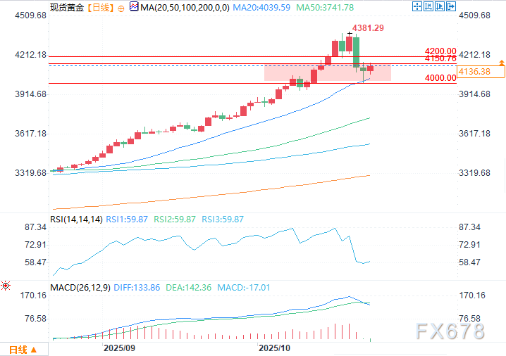周四(10月23日),现货黄金在一个狭窄的区间内波动,在从历史高点大幅回调后进行盘整。现货黄金盘中交易价格约为4133美元,在连续两天下跌后小幅上涨,因为在经济焦虑和地缘政治紧张局势的共同影响下,避险需求仍然得到支撑。