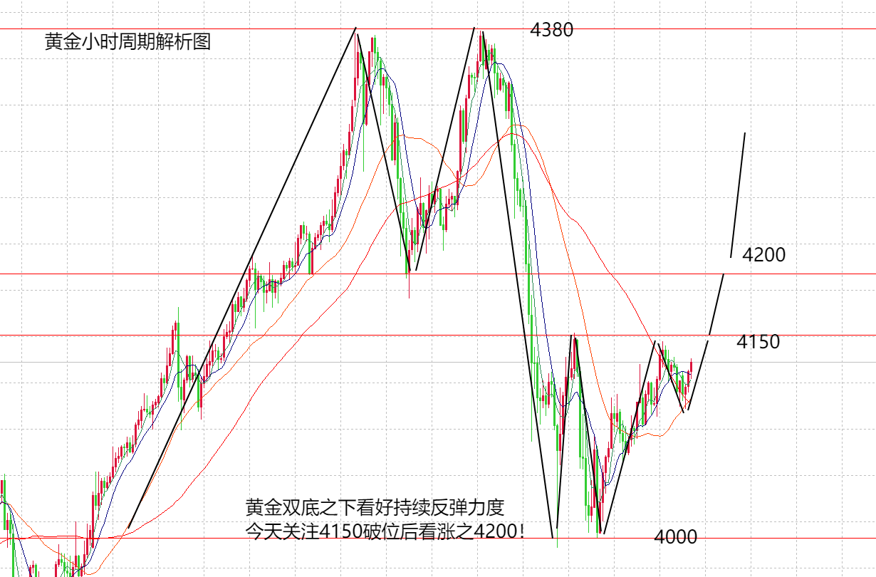 上个交易日黄金再次再4000之上布局多单,看到4150,这波力度到午夜盘实现了全部预测空间,但值得注意的是,暂时黄金并没有站稳4150之上,所以,不存在说黄金的进入绝对的多头趋势,因此,现在黄金只能看作是反弹走势,不过从结构上来看,黄金在4380形成双顶,在4000形成双底,几乎形成完美的涨跌闭环,大概率前期低点4000难以破位,只要在4000之上不看再次大跌空间,反而在底部反弹的基础上,形成了底部基础,只要站稳4150,多头开始反攻,那么,上方就有较大的遐想空间。按照技术面来看,日线站稳在布林中轨之上,周四的反弹结束了连阴的表现,今天继续收阳的概率很大,在今天收阳后,基本可以确定下周或者11月黄金将继续上涨。H4周期暂时布林收口,但暂时4150布林中轨压制比较明显,在这种情况之下,只能看作是小周期的反弹走势,并不算已经形成强势,今天站稳在布林中轨之上再看多头趋势爆发空间。所以,今天整体交易还是要等待黄金突破关键压制点,再看多头趋势的延续性。早盘黄金从4110附近开始上涨,目前以低位震荡看待,今天大概率还是慢涨走势,所以,还是有机会做低多交易,下方以4110为防守做多,上方看4150是否破位,破位的话看4200,今晚还有CPI数据公布,关注其影响。