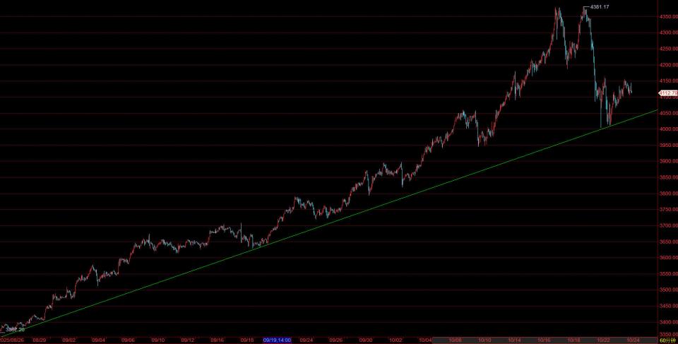 昨日黄金开盘4098.24美元,最高4154.79美元,最低4065.65美元,收盘4126.49美元,报收小阳线。上周五我们强调黄金4380承压下跌,过程中金价跌了193美元,本周周评《【格物金融趋势文章689】黄金大跌近200美元之后的走势研究》提及4380基本到位,后市要注意下跌为主,后市抉择3940美元。实际走势是本周黄金4380继续承压下跌,一路下跌到4004美元。这里基本是3311上涨以来的趋势线支撑,因此,每每到这里我们就强调走势抵抗,过去这两个交易日基本就是趋势线支撑反弹,然后冲高之后反复回落,周三我们4159看回落,昨天晚上短评《【黄金趋势线支撑,走势继续反复】》强调,4140承压回落,然后进一步4161承压回落。昨晚黄金最高到了4155附近下跌,截止今日最低到4105一线。