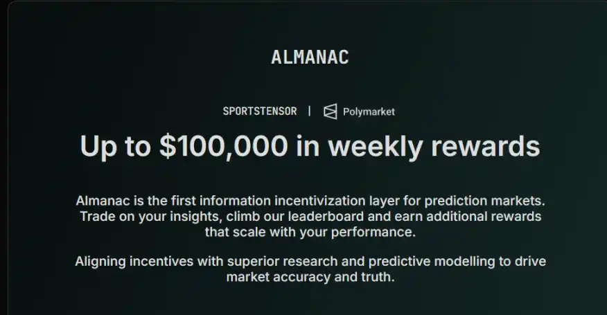 该团队还在打造「Almanac」平台——这是一个面向普通用户的体育预测竞赛层:用户可获取 Sportstensor 矿工提供的信号及高级预测分析数据,并借此与其他用户展开竞争。表现最佳的预测者每周可获得高达 10 万美元的奖励(上线时间待定)。