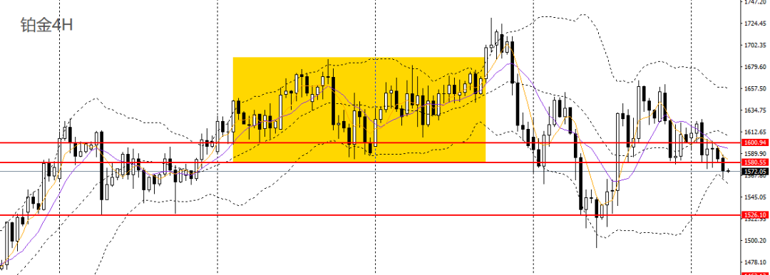 铂金延续回落,下破5日均线,日线呈头肩顶,4小时下破1580附近支撑,短线趋势进一步走弱,1600下方可延续高空思路。