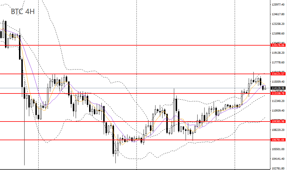 比特币连日拉升,日线RSI位于50左右,4小时于116000附近遇阻回落,但短线整体趋势仍偏多,如守稳113000附近企稳,后市预计将站上116000,挑战120000。