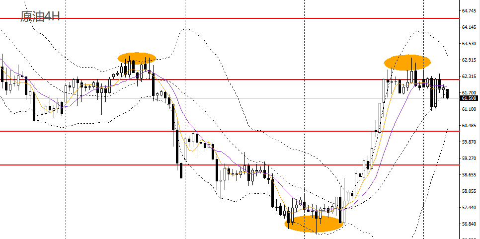 美原油昨日收十字阴线,4小时呈头肩顶,62成为上方第一强压,如继续承压于下方可择机进空,后市大概率将回踩60一线。