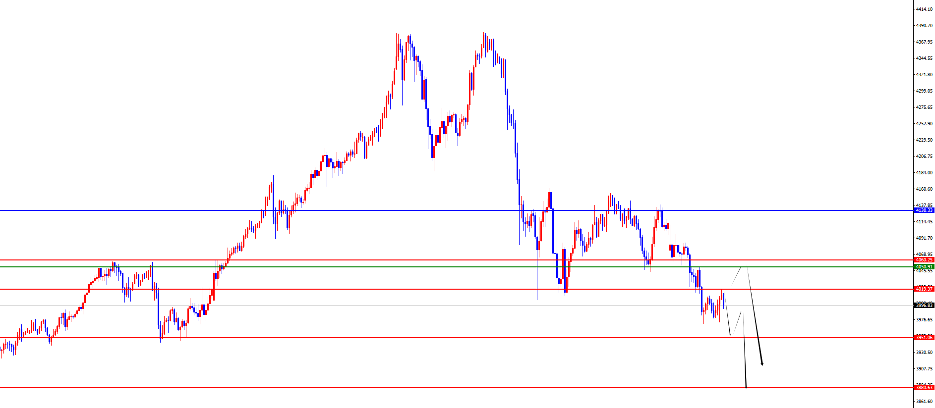 从多周期分析,首先观察月线节奏,从长线上看3150位置是长线走势的分水岭,价格在此位置之上长线多对待即可。从周线级别看,目前周线多空分水岭于3707位置,价格在此位置之上中线多对待即可。从日线级别看,暂时需要关注4130区域阻力,价格在上周跌破后持续震荡目前收盘在此位置之下,日线暂时波段看承压。四小时级别看,价格在上周四及周五于四小时关键位置上下盘整,同时震荡后跌破区间下边缘,所以后续整体依托四小时阻力看承压,位置上暂时关注4050-60区间,下方关注3950-3880区域。一小时上看早盘高点位置得失决定价格能否弱势承压。