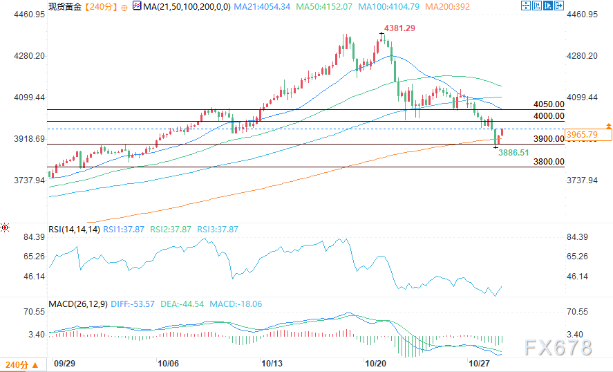 汇通财经APP讯——周二(10月28日),现货黄金在早盘遭受沉重抛售压力后企稳,因投资者在风险偏好情绪回升的情况下继续撤出避险资产。现货黄金盘中报3968.67美元左右,当日下跌0.31%,此前曾短暂跌破3900美元关口,创下三周来的最低水平。