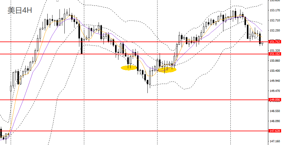 美日日线呈黄昏星,刺破10日均线,今日亚盘跌破近期新低,4小时回踩关键支撑151.70附近,决议前预计将持续回落,空单仍可持有,短线可看空至151-151.20。