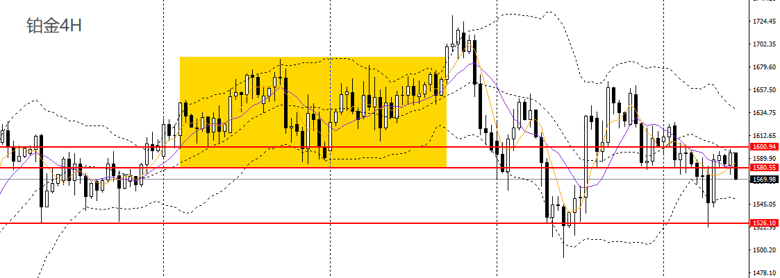 铂金收十字星,仍徘徊于5日、10日均线附近,4小时回踩1520附近支撑,收看涨吞没阳柱,但1600附近仍面临强压,如无法升破,多单建议离场。