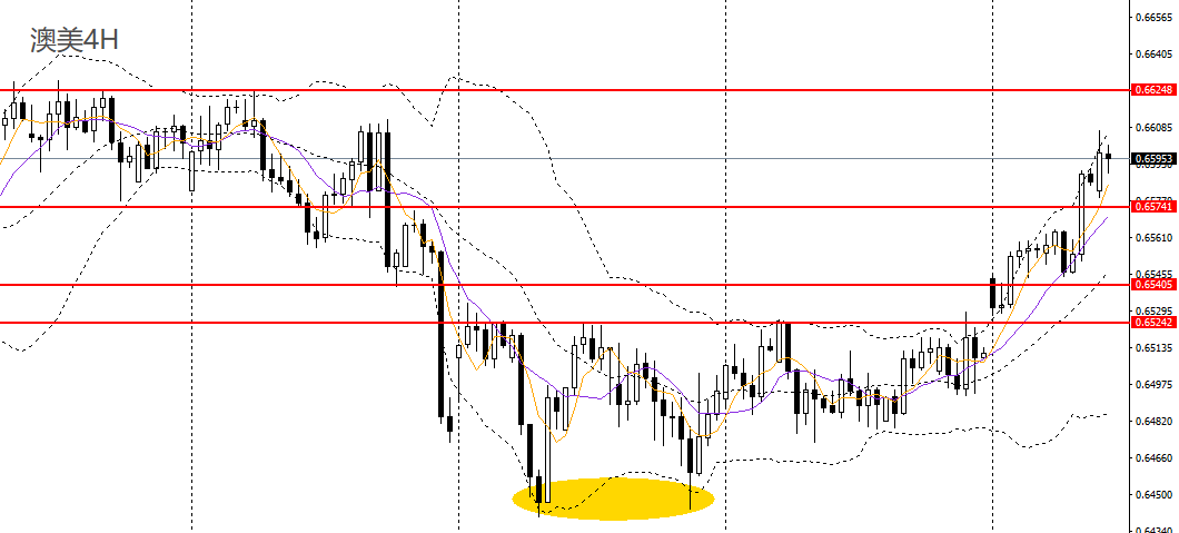 澳美延续涨势,日线RSI上扬,4小时触及0.66-0.6620压力带,短线走势强劲,多单仍可持有,如于0.6620附近承压,多单可暂时离场。