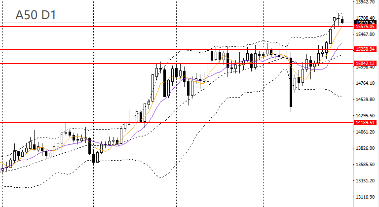 A50刺破前高,于15700附近遇阻回落,4小时多头动能继续放缓,如持续承压于15700下方,多单建议离场,后市预计将回踩15500,15300附近。