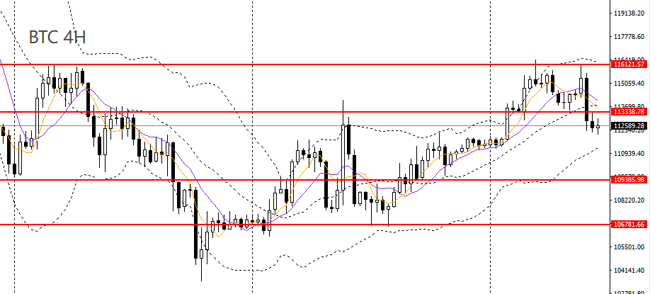 比特币冲高回落,下探5日均线,4小时呈双顶,116000附近面临强压,如无法重新站上113000,短线预计将重新回踩110000关口。