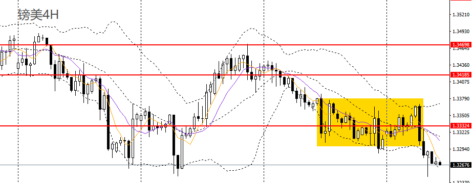 镑美昨日大幅跳水,逼近前低,承压于5日均线,4小时下破此前震荡区间下沿1.33,短线趋势彻底转弱,1.33下方可延续空头思路,如重新站上1.33,可等待1.3330附近承压进空的机会。