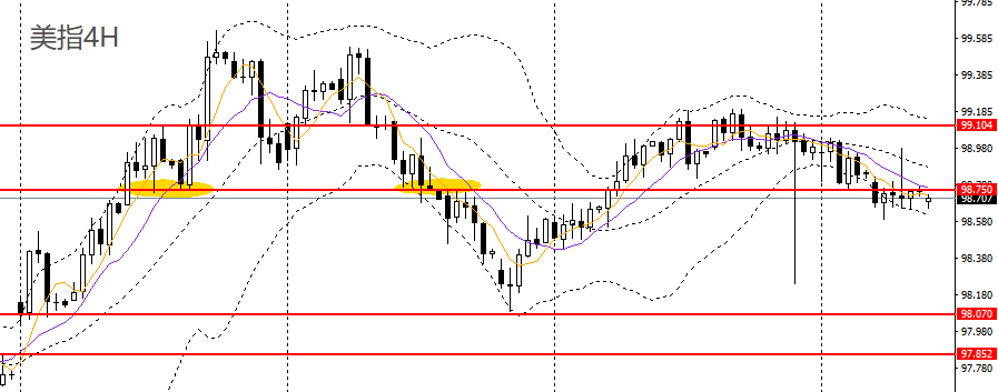 美元指数收十字星,日线RSI位于50附近,98.70成为关键节点,如彻底承压于下方,后市预计将下探98-98.20。