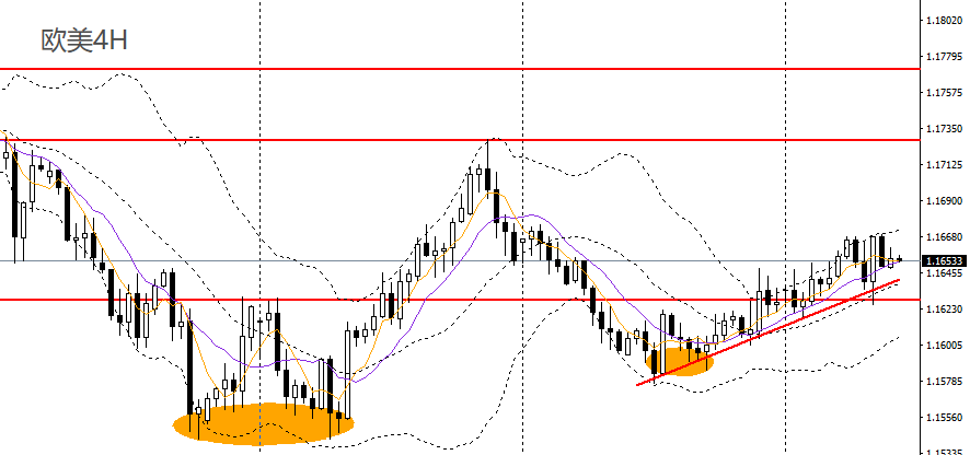 欧美连日收十字阳线,日线RSI仍位于50附近,4小时继续于1.1670附近遇阻回落,多头力量有所减弱,如于1.1630-1.1650一带企稳可进多,如升破1.1670,后市有望挑战1.17,如于1.17附近承压,短线多单建议离场,可反手做空。