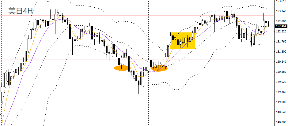 美日昨日收长阳柱,继续围绕5日、10日均线震荡,4小时一度冲高至153上方,但多头力量减弱,高位谨慎追多,152.30附近企稳可进多。