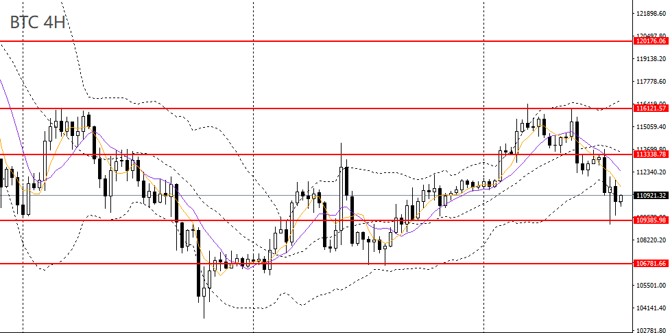 比特币延续震荡回落,继续刺破10日均线,4小时刺破110000关口,短线走势偏弱,如继续承压于113000之下,后市大概率将失守110000,进一步下探106000附近。