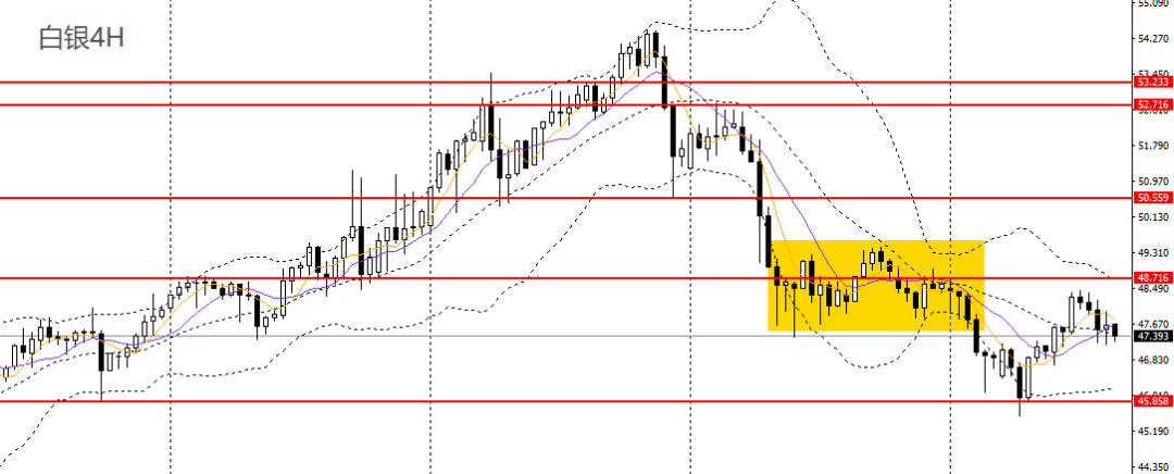 白银小幅反弹,上探5日均线,日线RSI位于50附近,4小时一度刺破48关口,但多头力量有限,多单建议及时离场。
