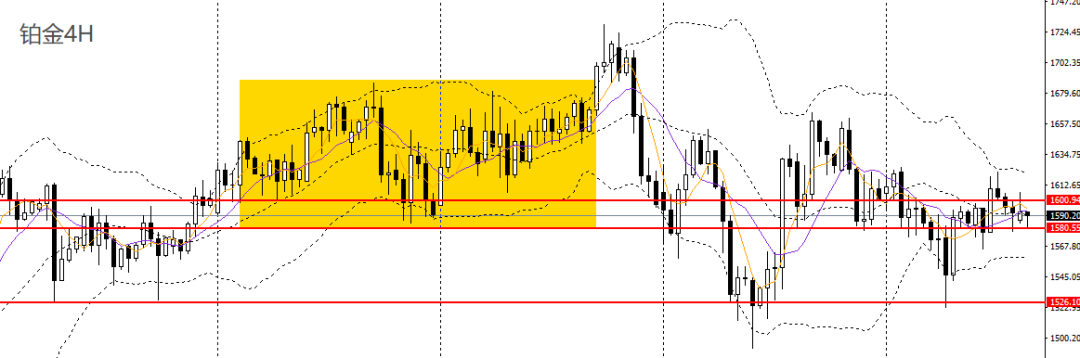 铂金收十字阳线,4小时维持微幅震荡,短线方向不明朗,如于1600附近承压可维持高空思路。