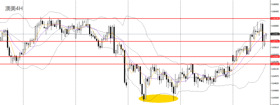 澳美冲高回落,日线RSI位于50上方,4小时于关键压力0.6620附近遇阻回落,但空头动能有所放缓,空单可暂时离场,稳健者建议观望。