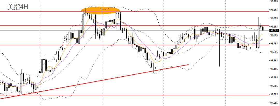 美元指数强势反弹,日线RSI站上50,4小时最终守住98.70附近支撑,且升破99大关。如维稳于99上方,后市预计将上探99.50-99.60。