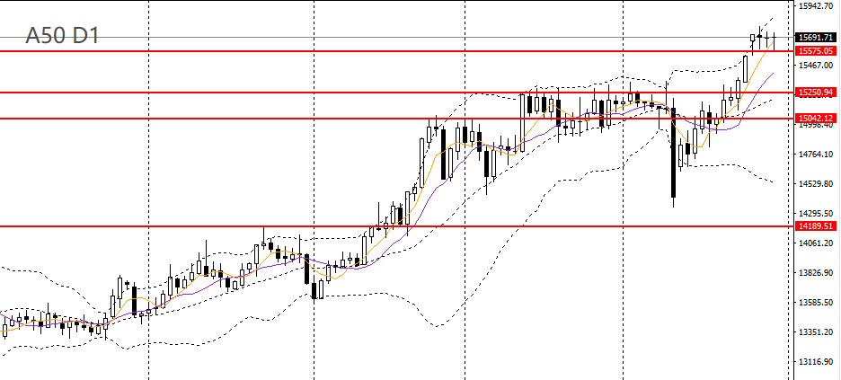 A50微幅震荡,回踩5日均线,日线RSI位于高位,4小时始终承压于15700,可暂时观望,如回踩15500附近企稳可进多,后市有望彻底升破15700,如下破15500,多单建议离场。