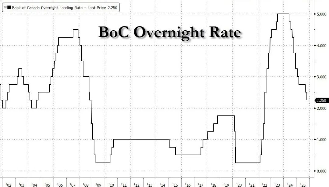加拿大央行将基准隔夜利率下调25个基点至2.25%。