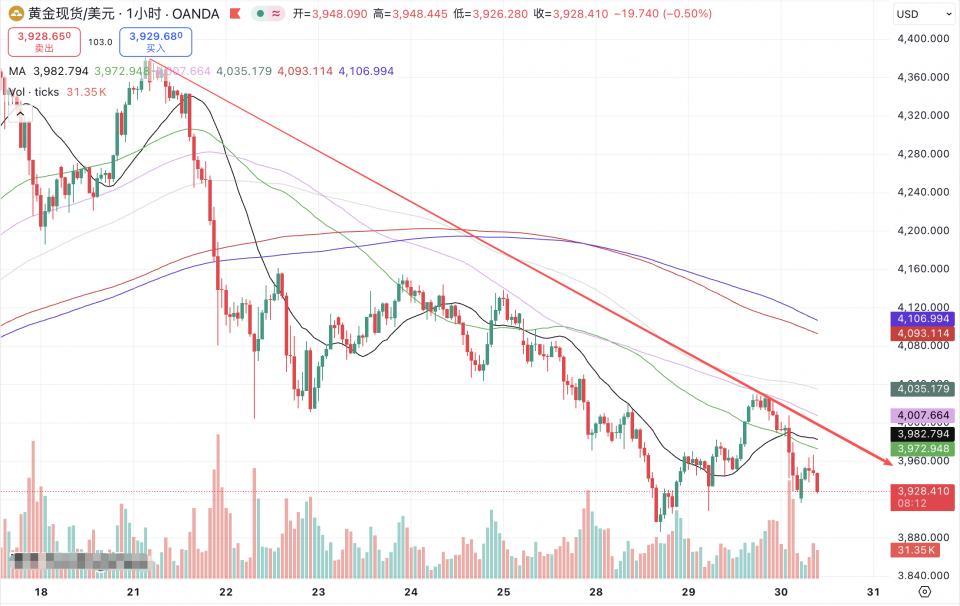 周三金价遇阻1小时MA89线回落,晚间尽管美联储宣布降息,但鲍威尔主席对12月降息持谨慎观点,金价在消息公布后结束反弹,价格跌落4000美元/盎司,今天(10月30日)早盘黄金先涨后跌,目前空头回补的力度显然不足以支撑价格重返4000美元,我们早盘乘势做了多个空单均取得成效(下图)。