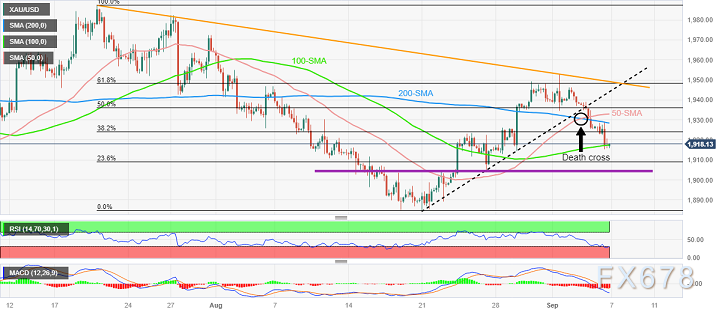 Panchal指出,在MACD指标的看跌信号的支持下,金价周三连续第5个交易日下跌,证明本周开始的均线“死亡交叉”是合理的。然而,值得注意的是,相对强弱指数(RSI)处于超卖区域,这反过来又突出1917美元/盎司附近的100周期简单移动平均线(SMA)支撑位,这是对黄金卖家的短期关键挑战。