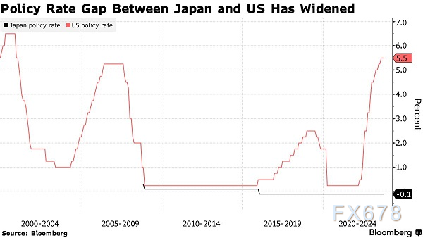 自2016年以来,日本央行的政策利率一直保持在-0.1%,而美国的政策利率目前已经升至5.5%。