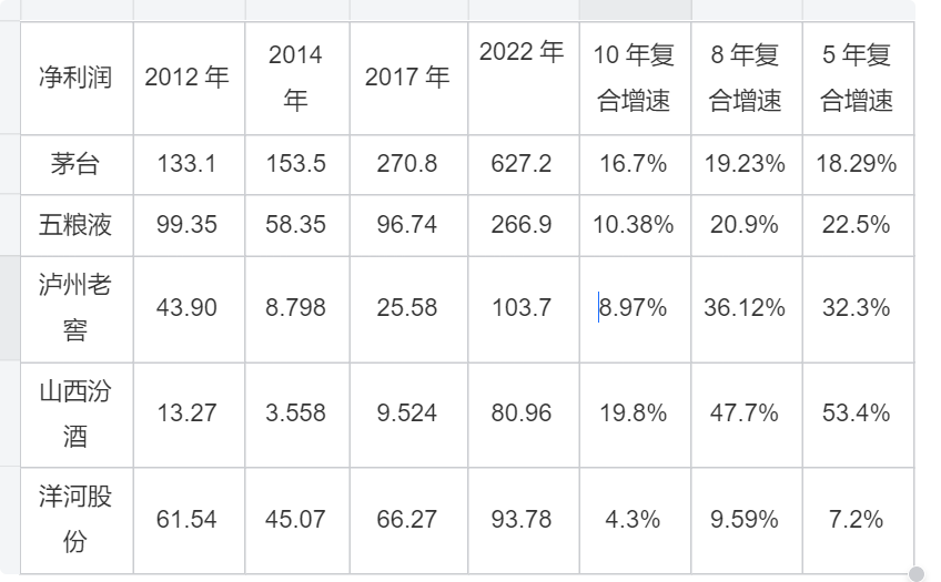 股价长期围绕内在价值波动,内在价值由取决于企业经营状况,我们有必要探索一下过去8年,5年洋河的利润增长情况,并和其他同业公司对比。