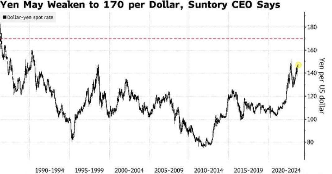 三得利CEO:日元兑美元恐暴跌至170