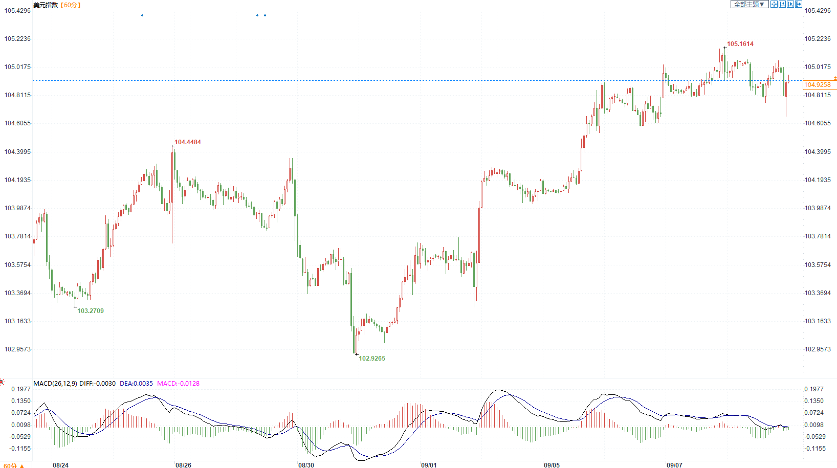 截止发稿,衡量美元兑主要货币的 美元指数下跌0.05%,至105,但与前一交易日的六个月高点105.15相距不远。该指数有望连续第八周延续涨幅,迄今为止已上涨0.7%。