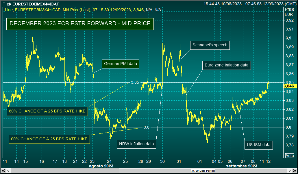 对于欧洲央行是否会在周四加息,投资者的看法几乎是平分秋色,欧元短期利率 (ESTR) 远期定价中加息25个基点 (bps) 的可能性为45%,而前一天为 40%左右。