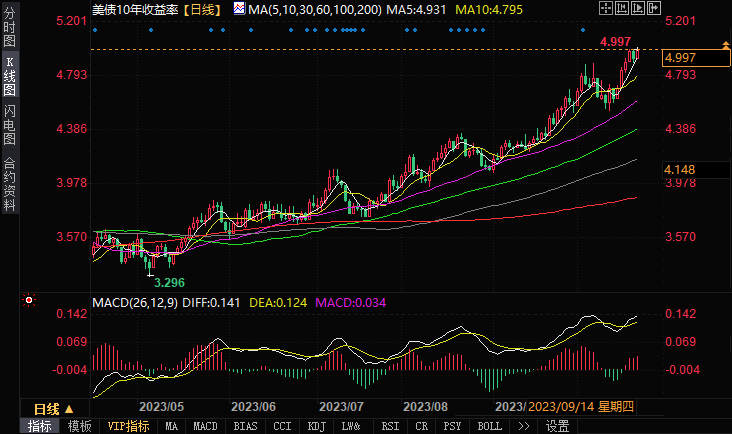指标美国10年期公债收益率将录得1994年年中以来最大六个月涨幅,自4月底以来已上升152个基点。该收益率目前上涨5个基点,至4.969%。