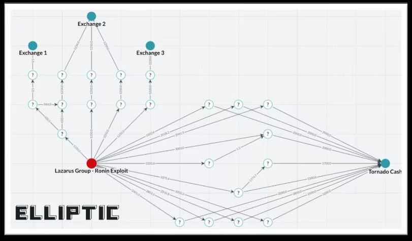 去年,Axie Infinity(流行的元宇宙游戏平台)用于将数字资产转移到链上的 Ronin 桥经历了最大的加密黑客攻击之一,其中 6.15 亿美元的以太坊 (ETH) 和 USDC 稳定币被盗,美国当局将其联系起来朝鲜黑客组织 Lazarus Group 的抢劫案。犯罪分子首先通过去中心化交易所(DEX)将 USDC 稳定币兑换成 ETH,而去中心化交易所通常不进行了解客户/反洗钱(KYC/AML)合规检查。过去几年,受到监管审查的中心化交易所已经开始这样做。有趣的是,如图所示,他们随后开始通过三个中心化交易所洗钱 1670 万美元的 ETH。然而,随着中心化交易所开始与执法部门合作,犯罪分子转而使用 Tornado Cash 去中心化混合器,该混合器后来受到美国财政部外国资产控制办公室 (OFAC) 的制裁,并在有效性方面失去了上诉法庭的制裁。据 Elliptic 称,Elliptic 调查人员正在追踪这些被盗资金,并在我们的系统中标记了与该攻击者相关的地址。”