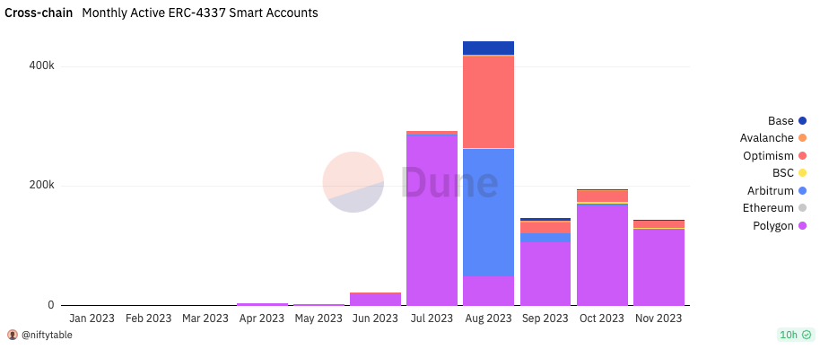在 11 月 14 日X(以前称为 Twitter)上发布的帖子中,Rising 分享了一些数据点,这些数据点显示,支持 ERC-4337 的智能账户的用户数量下降,交易活动低下,而且核心基础设施提供商的运营成本低下。