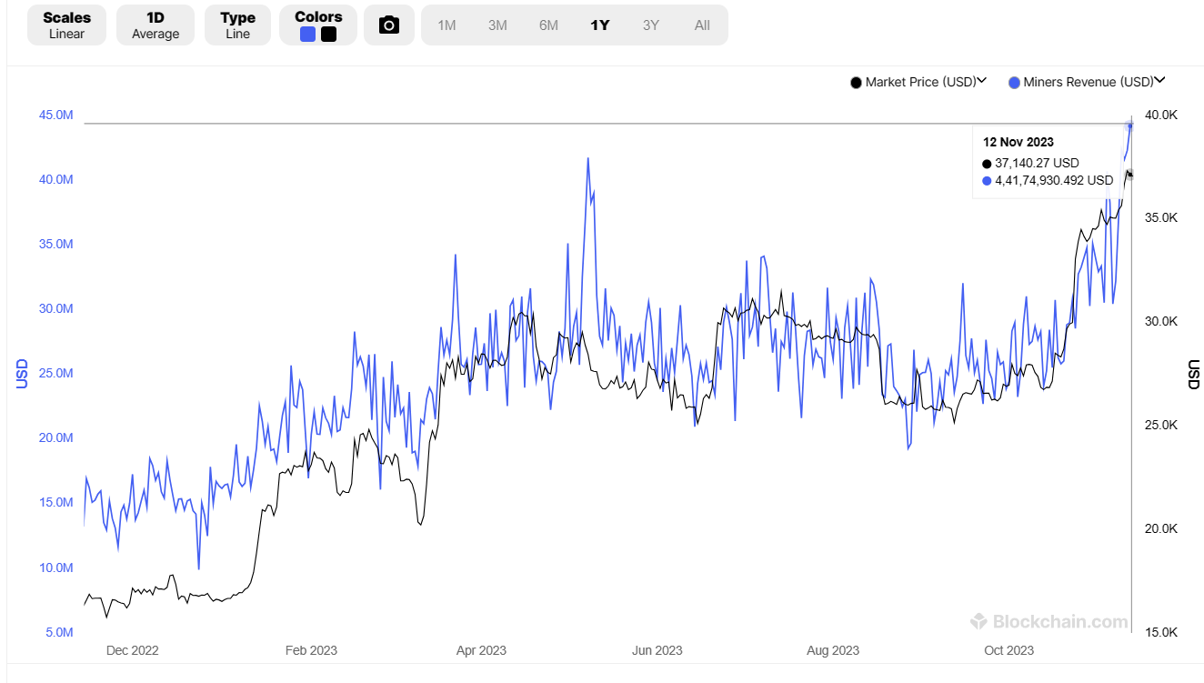 根据Blockchain.com 的数据,11 月 12 日,比特币每日挖矿奖励在 2023 年首次突破 4400 万美元,该数字上次出现是在 2022 年 4 月。