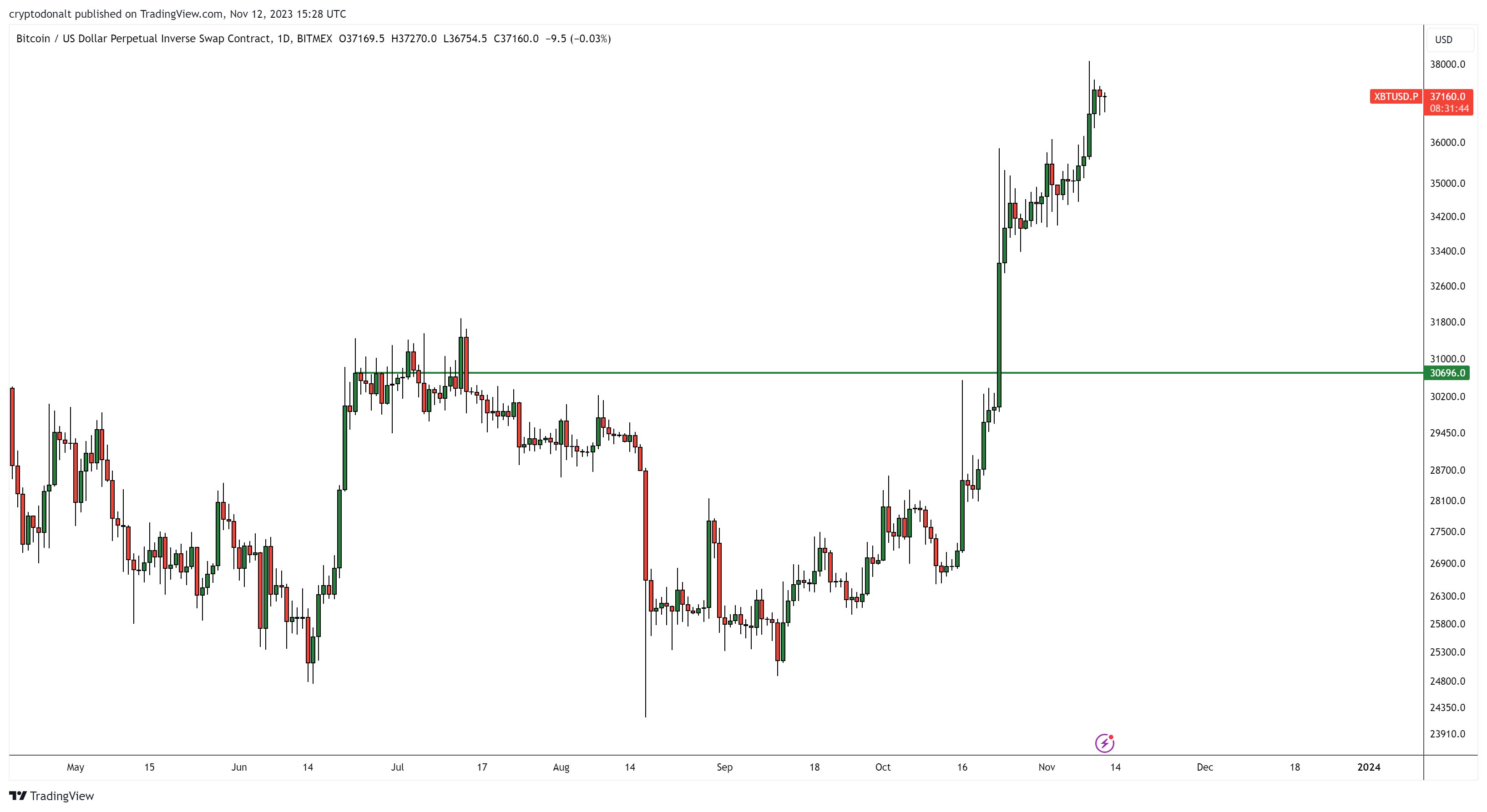 我们正处于市场周期的这个奇怪时刻,如果我们一个月内的交易价格达到 60,000 美元,我不会感到惊讶,截至撰写本文时,比特币交易价格为 37,033 美元。朝着 DonAlt 的目标飙升表明,在短时间内收益增加了约 60%。
