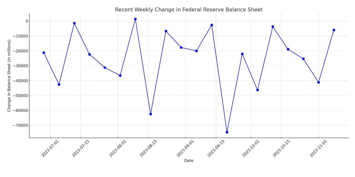 美联储的资产负债表最近进行了更新,显示其资产负债表总额出现了可量化的下降。截至11月8日,资产负债表显示总计7.861T,表明美联储量化紧缩策略仍在继续。值得注意的是,上周资产负债表减少了约60亿美元。