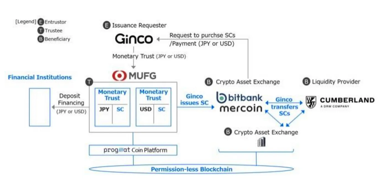 MUFG于 2022 年 2 月与其他日本大型银行联合推出了 Progmat 平台。它受到 2023 年 6 月生效的修订后的《支付服务法》的监管。修订后的法案规定了三种类型的稳定币。Progmat 将支持由信托银行发行的“信托”类型硬币。